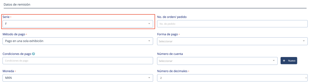 El campo “Serie” se encuentra en la segunda sección del formulario como se muestra en la siguiente imagen: