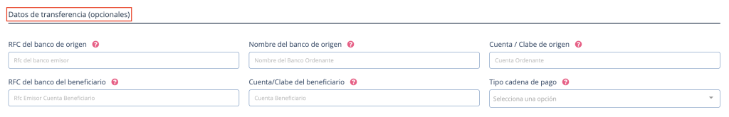 1. Dependiendo de la forma de pago seleccionada, es posible que aparezcan algunos campos extras relacionados con la información del banco, por ejemplo en el caso de seleccionar Transferencia Electrónica de Fondos, estos campos sólo se llenan si el cliente los requiere, ya que fiscalmente no son obligatorios.