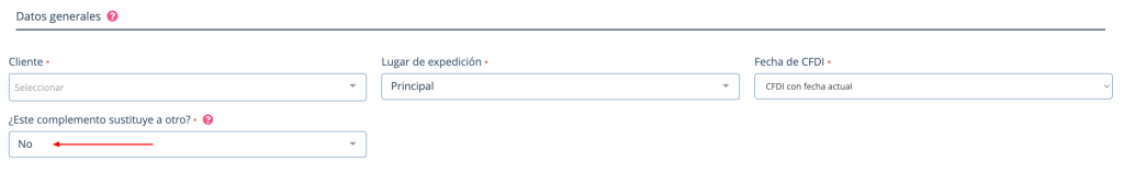 1. Llena todos los campos correspondientes, cliente, lugar de expedición, fecha de CFDI, por defecto, la pregunta si este complemento sustituye a otro, está con un “No” pero puedes cambiarlo y relacionar el CFDI al que sustituye, si es el caso.